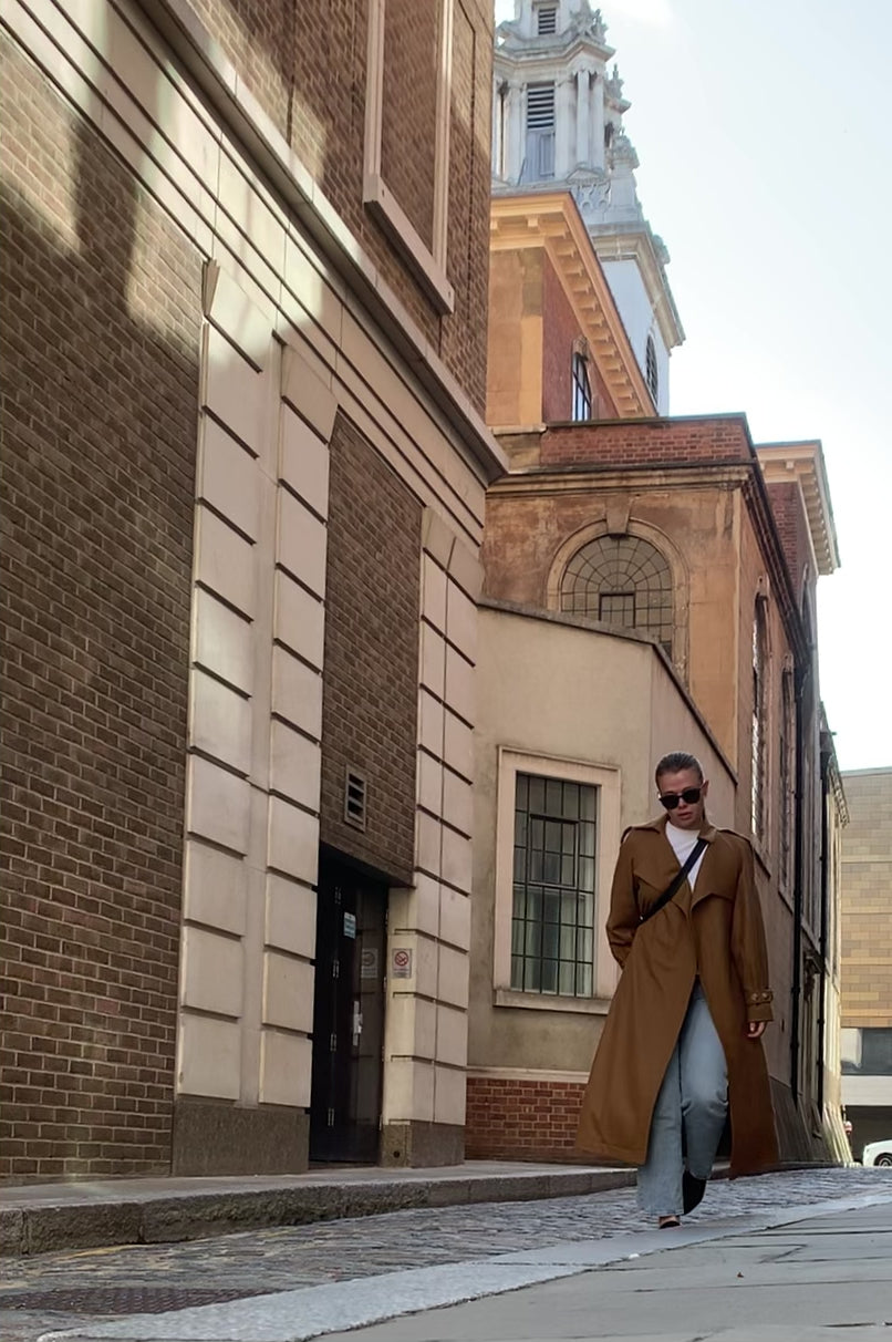 Beżowo-miodowa odsłona naszego bestsellerowego modelu płaszcza. Kolor i sposób układania się tkaniny przywodzą na myśl gęsty słony karmel.