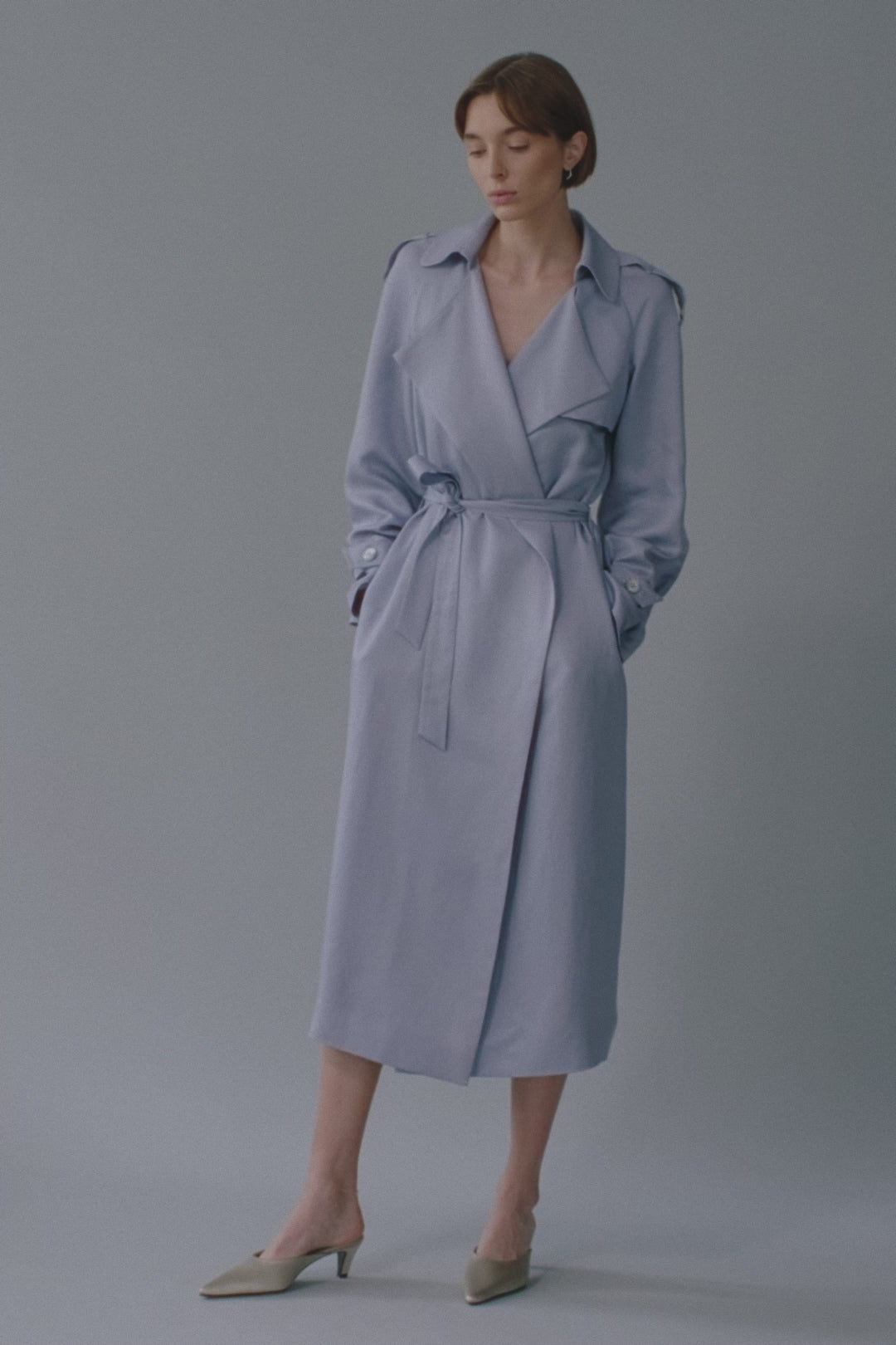Trench w kolorze błekitnym uszyty z lekkiej tkaniny z lnu i tencelu. Tkanina jest lejąca i przyjemnie opływa sylwetkę. Płaszcz ma miękką, wiskozową podszewkę - dzięki naturalnym włóknom skóra w tym płaszczu będzie oddychać. Guziki z masy perłowej przy mankietach.