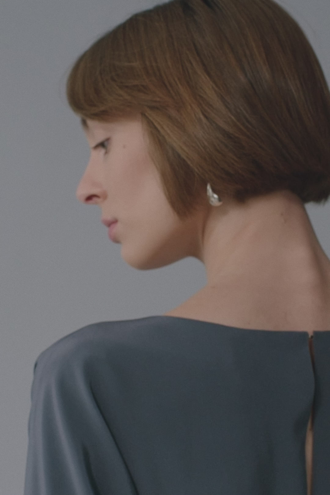 Jedwabna sukienka na wyjątkowe okazje. Dekolt w łódkę, kimonowe rękawy, elegancki grafitowy kolor. Pas w talii można wiązać na wiele różnych sposobów - z przodu, z tyłu, z podkreśloną talią lub nie. Z tyłu głębokie wycięcie i zapięcie na niewidoczną haftkę.