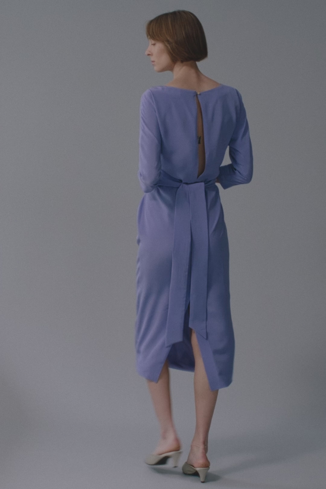 Jedwabna sukienka na wyjątkowe okazje. Dekolt w łódkę, kimonowe rękawy, w intrygującym odcieniu błękitnego fioletu. Nazwa nawiązuje do koloru kwiatu Wisterii. Pas w talii można wiązać na wiele różnych sposobów - z przodu, z tyłu, z podkreśloną talią lub nie. Długi pas można również potraktować, jak apaszkę przewieszając przez szyję. Z tyłu głębokie wycięcie i zapięcie na metalowy guzik w złotym odcieniu.